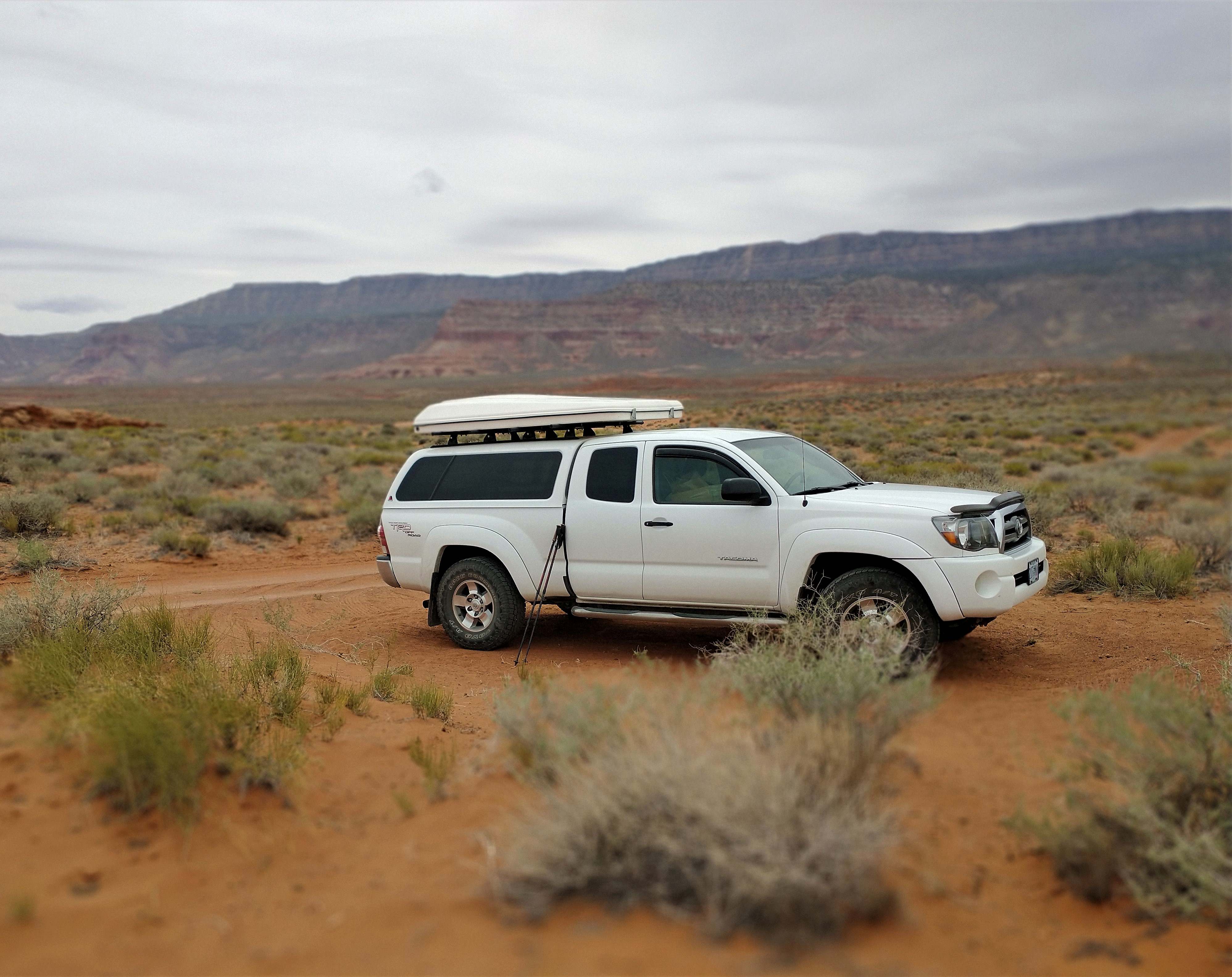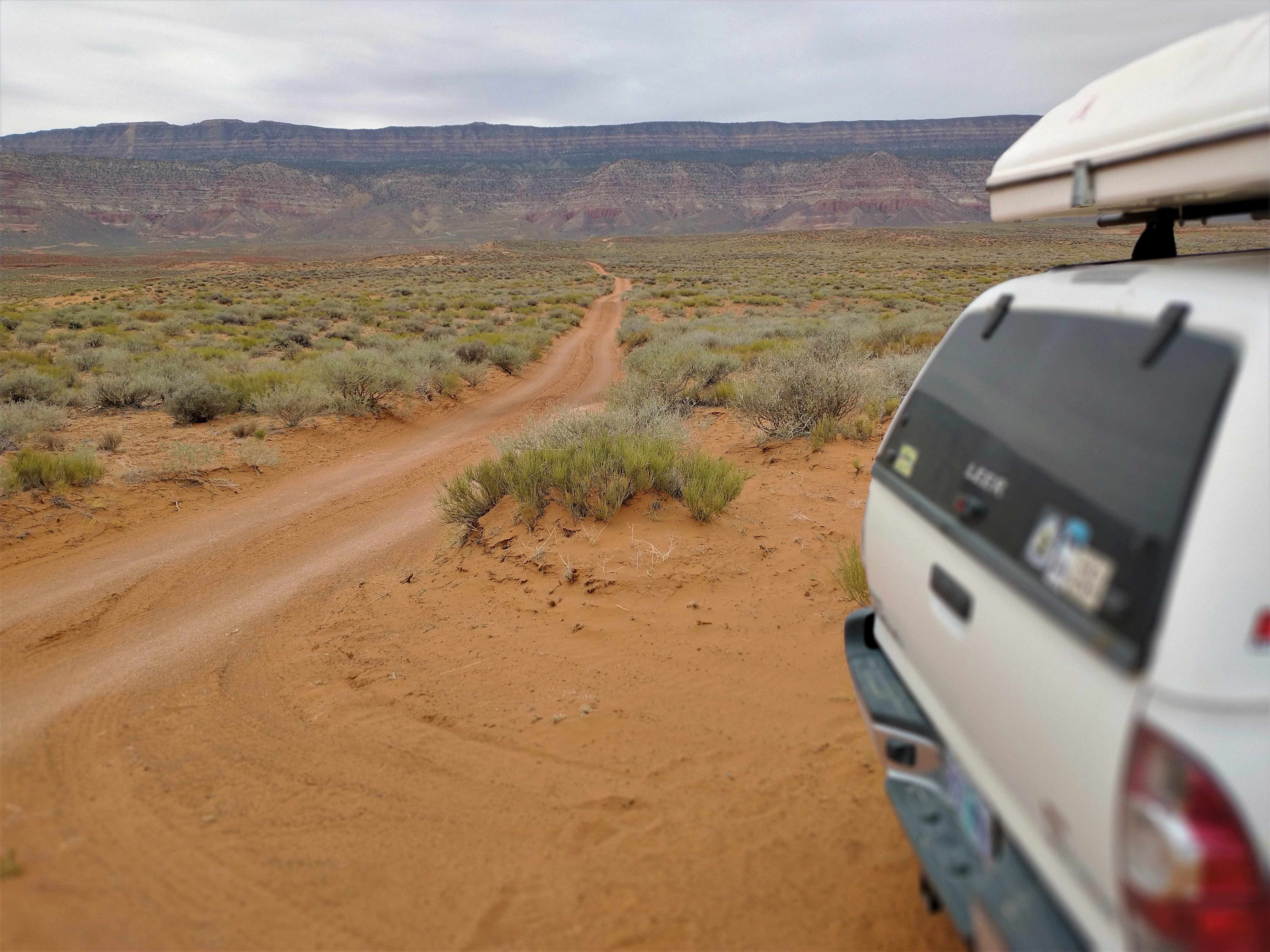 The road in to Willow Gulch trailhead. Kaiparowits Plateau in the background.At the Willow Gulch trailhead.Ready to go.
