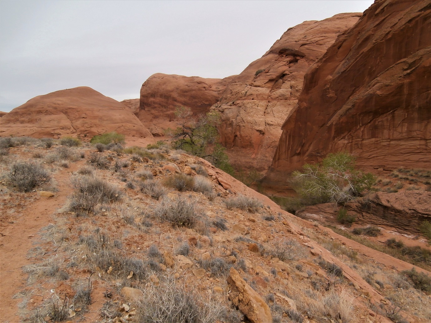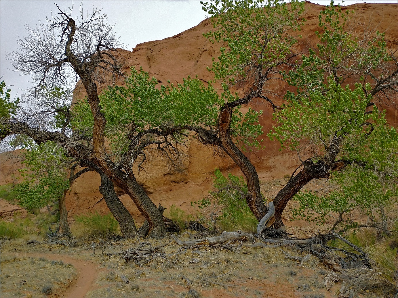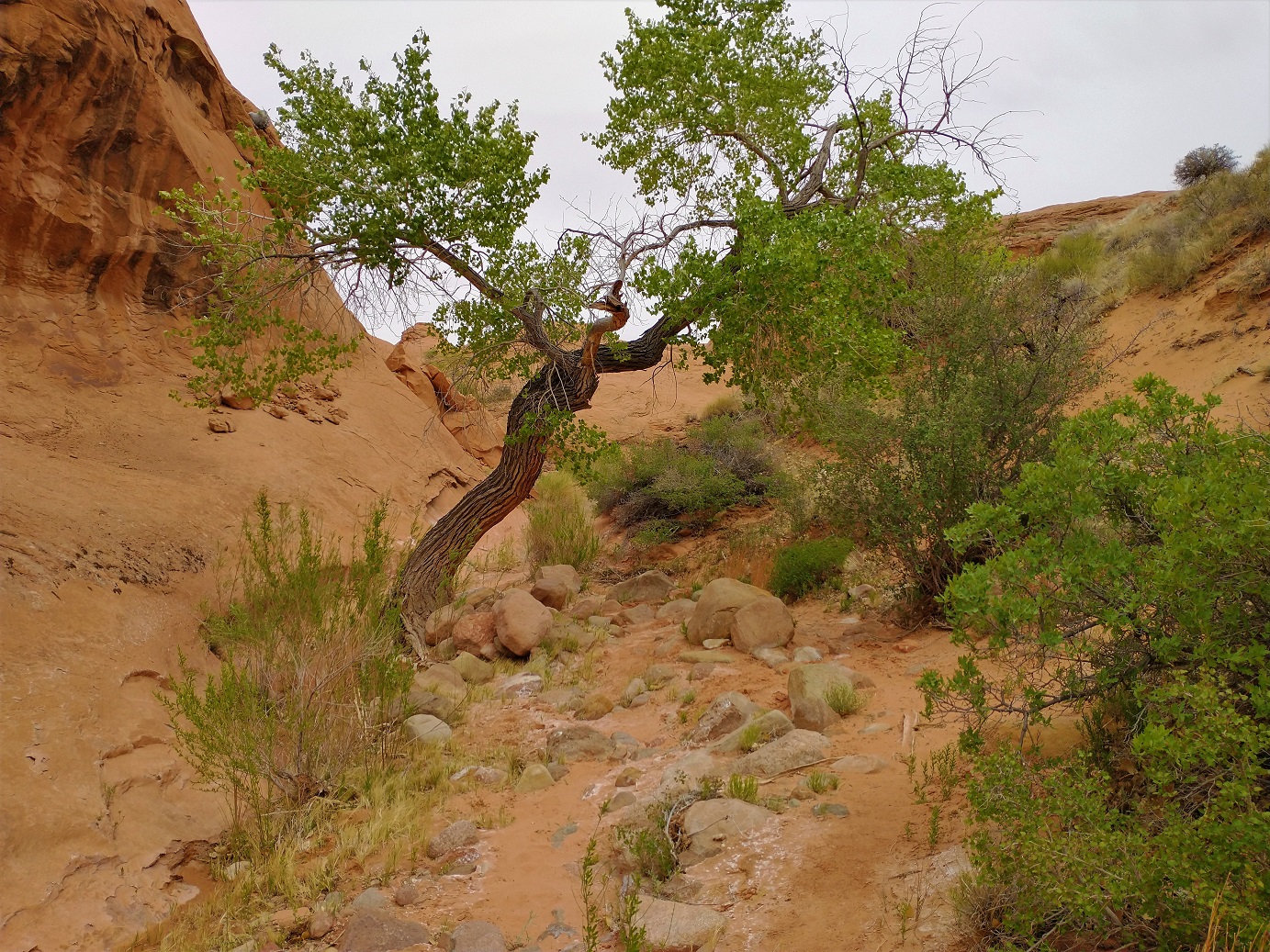 Cottonwoods find enough water in the soil to establish themselves as the stream descends toward the river. The day I hiked the trail was overcast so the red sandstone color was subdued.