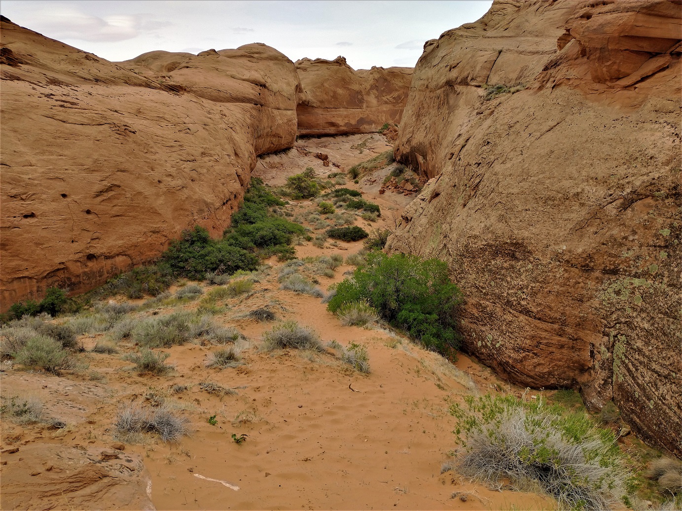 In the Spring of 2023, I traveled to SE Utah and Grand Staircase- Escalante National Monument for the express purpose of traveling the Hole-In-The-Rock road south of Escalante, UT. The road leaves scenic Utah Highway 12 and traces the torturous route originally blazed by Mormon pioneer families in 1878-1879 on their way to found a new settlement on the San Juan River. Their short lived agricultural settlement became the small, present day outpost of Bluff, UT. My ultimate goal was to find and hike from the Willow Gulch trailhead down a sandstone canyon to Broken Bow Arch which had only recently emerged from the waters of Lake Powell after the reservoir level fell dramatically following years of drought. The trailhead is near the end of Hole-In-The-Rock road, some 50+ miles of rough road from where it begins, requiring 4WD and speeds of 15~25 mph. Thanks to an early start, I reached Willow Gulch by mid-morning in time to start the descent.