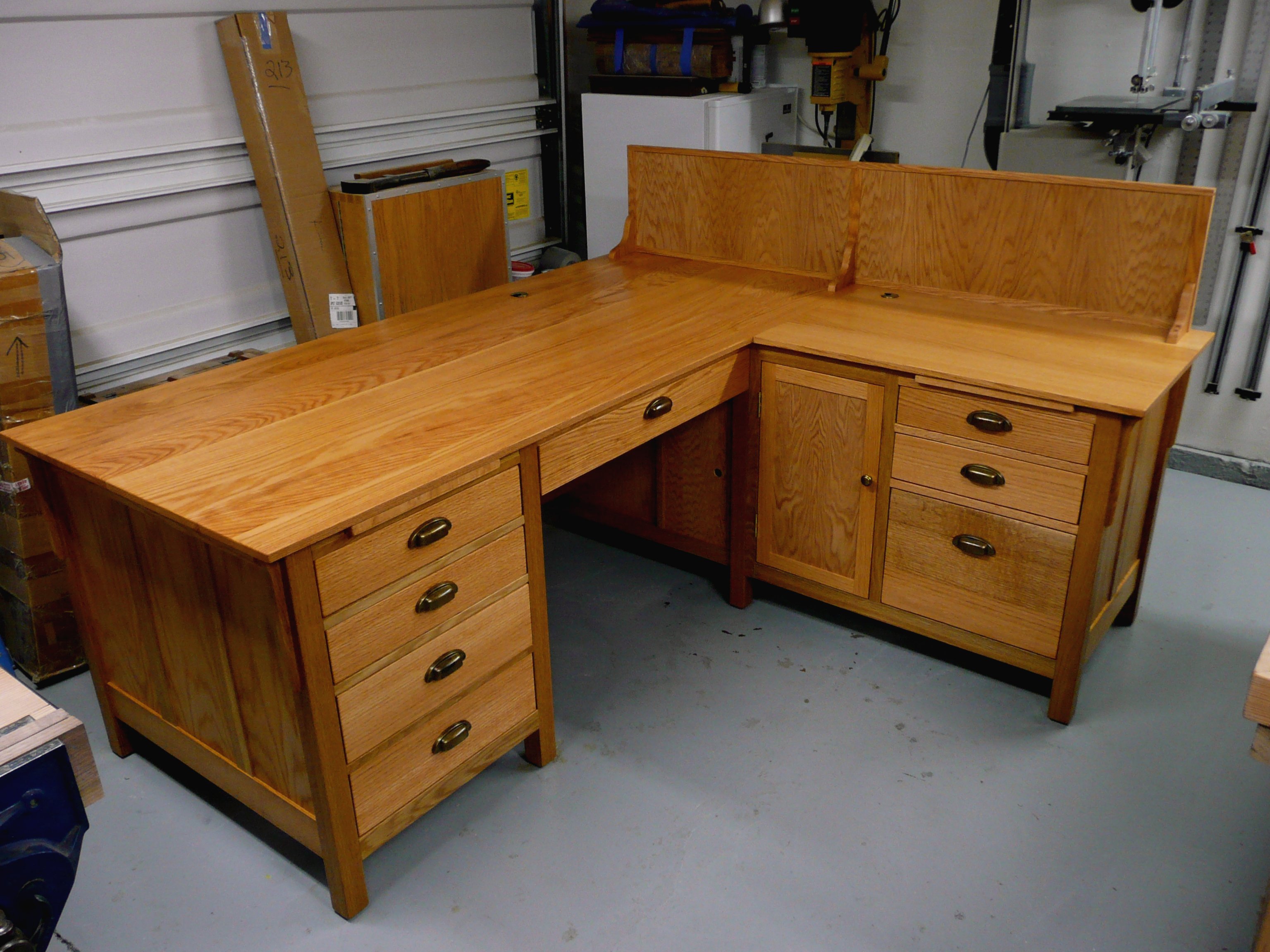 I completed this commission for a couple in Wallowa County, Oregon several years ago. The piece is solid oak throughout and includes a full hanging file drawer in the return. The interior was built to accommodate an Apple computer tower and hidden wiring channels that led to a color printer on top of the return. [Photo Max Vollmer, Click on image to enlarge]