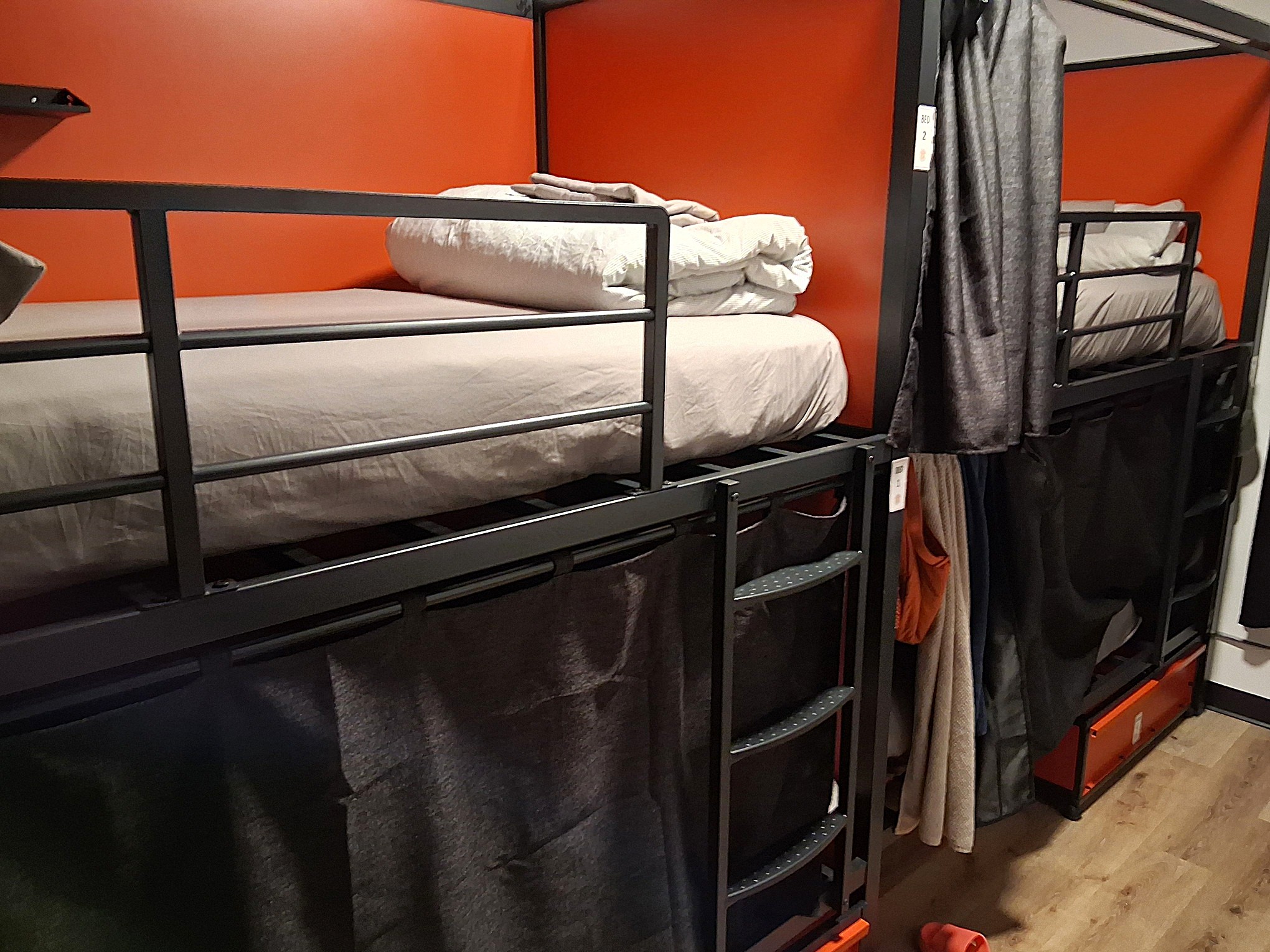 I stayed in a 4-bed room and got a good night’s sleep both nights. Four metal lockers on rollers for personal belongings slid under the bottom bunks. Each bed also had a lamp and an outlet against its back wall to charge a phone, and a privacy curtain. I had one roomate, a young woman, who was cool with the arrangement.