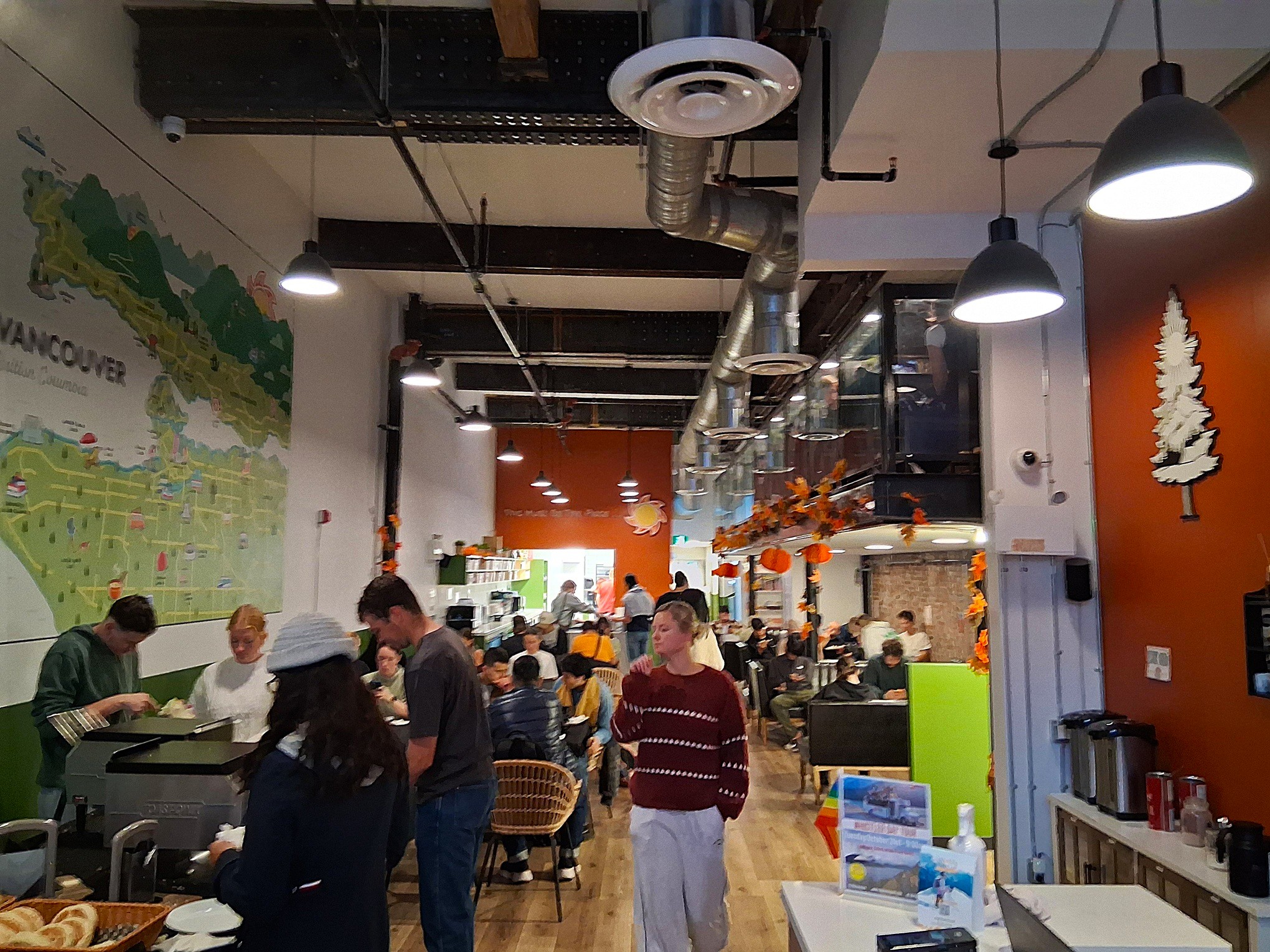 I made this trip by train, VIA Rail, from Vancouver, BC, to Halifax, NS, to visit my son Karl. For the first two nights, I stayed in the Samsun Hostel in downtown Vancouver. It was affordable, efficiently laid out with individual rooms ( 4 or 8 beds), plus shower rooms and bathrooms on all four floors. Everything was kept very clean by staff and guests. Free, all-you-can-eat breakfast was a healthy mix of fresh fruits, cereals, and bagels with butter and jam. Staff provided the food, but guests bussed and washed all their own plates, bowls, cups, etc. in the kitchen area at the back of the main floor. [All photos