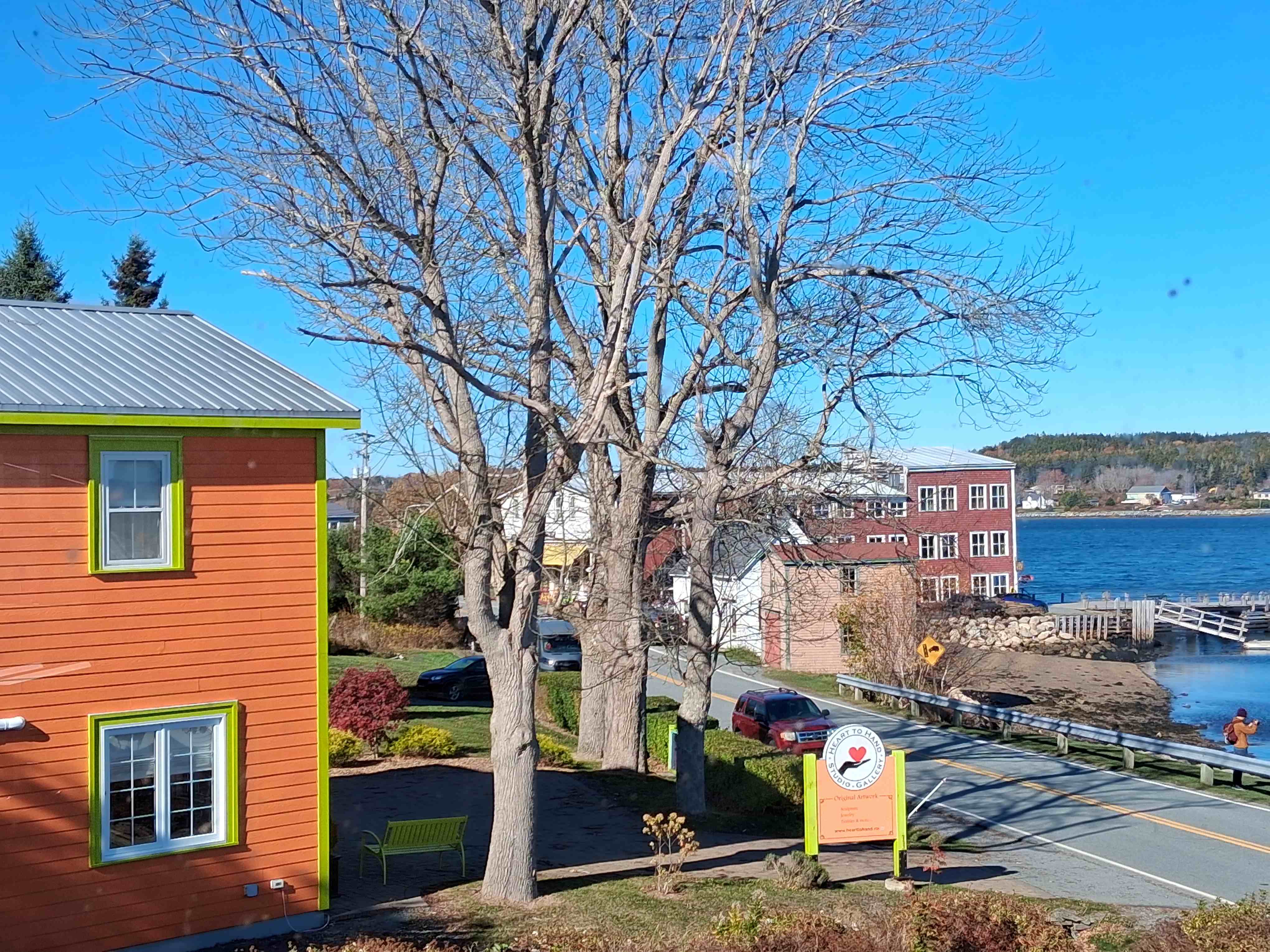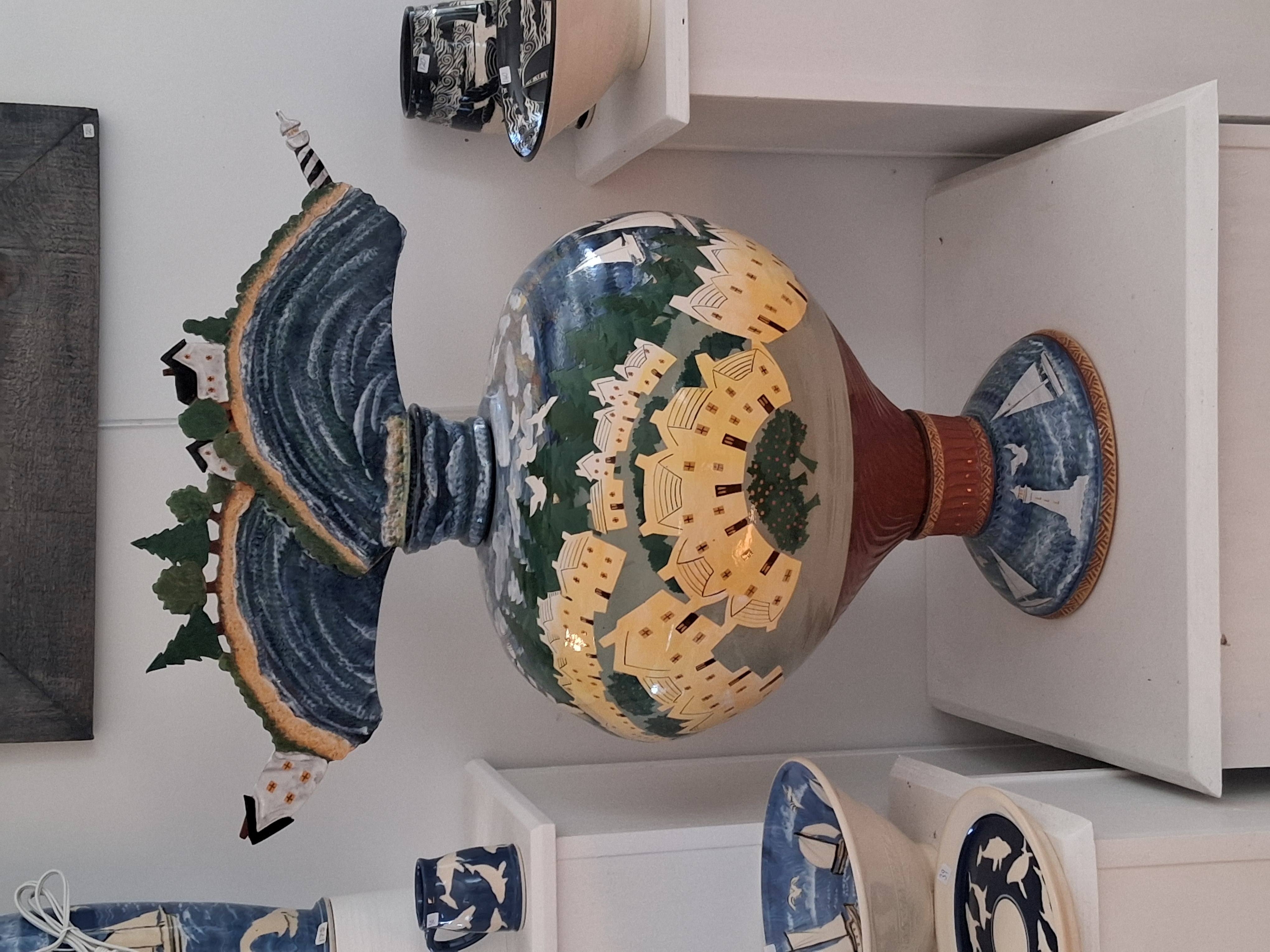 Le Have galleries along the waterfront.Westcote Bell Pottery in Le HaveLarge ceramic jar with iconic images of Nova ScotiaArtwork, Le Have