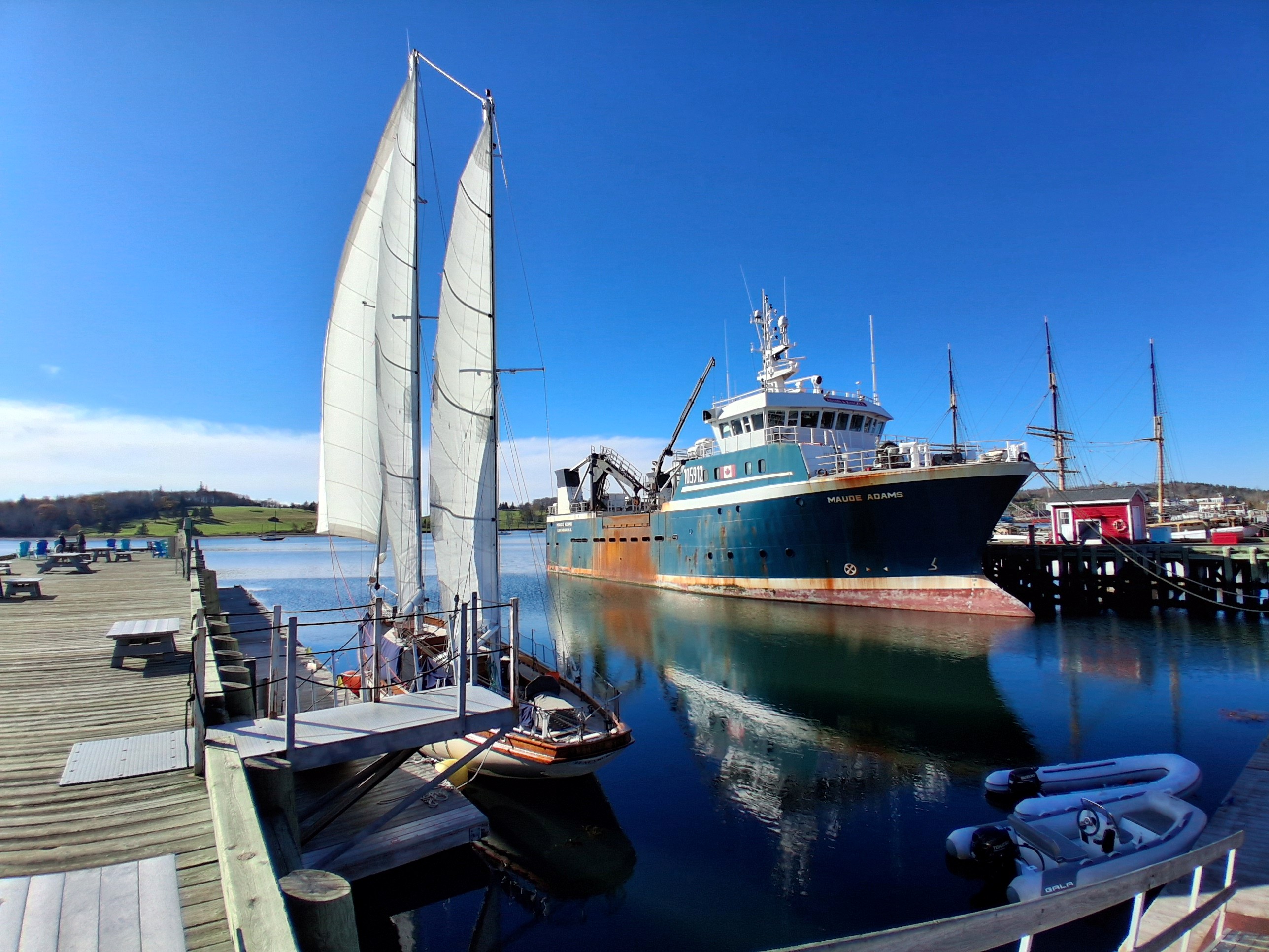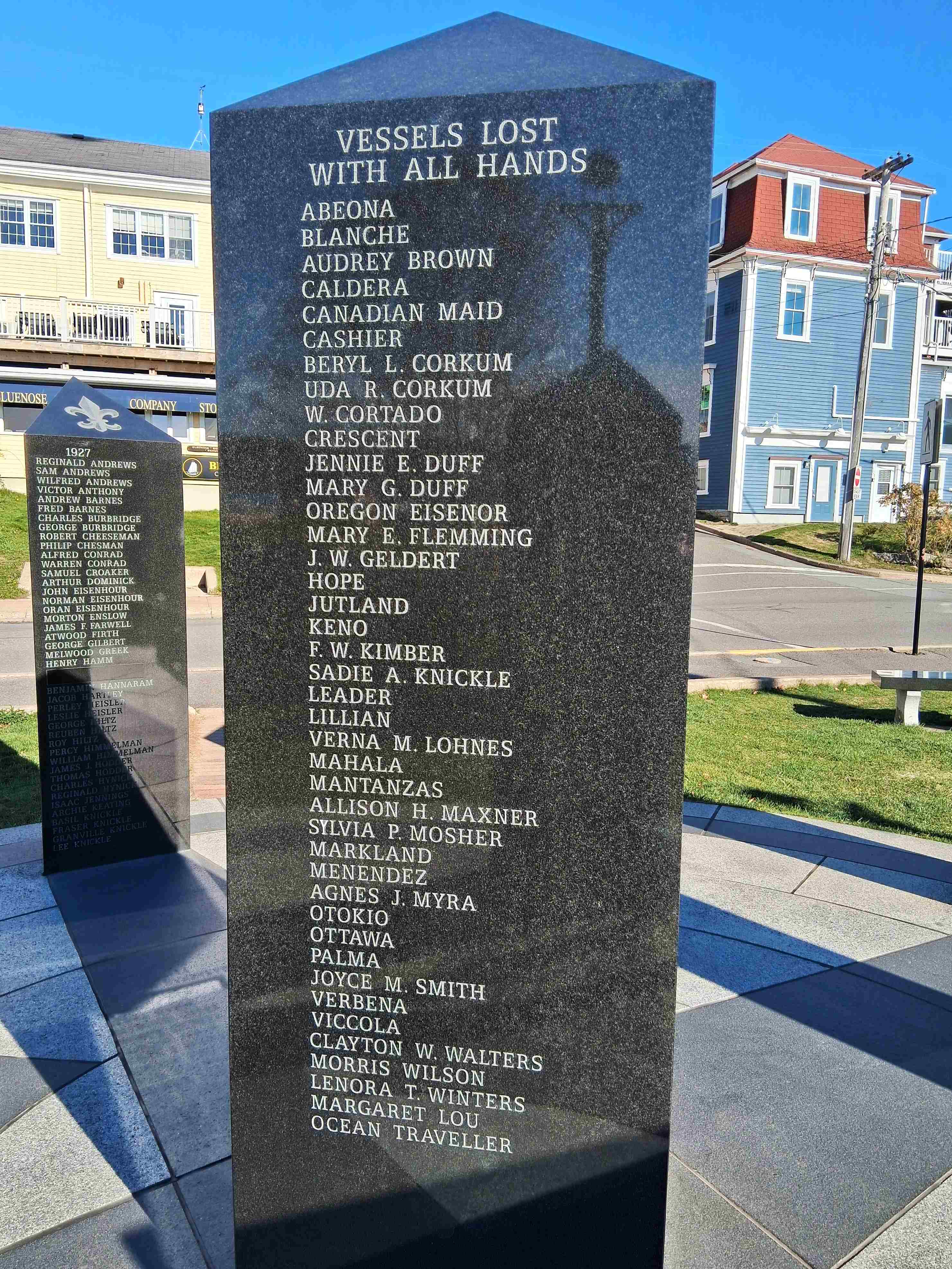 Black granite pillars on the dock at the waterfront bear the names of ships and their crew members, based in Lunenberg, lost to the sea. The first name recorded is from 1898, but no doubt unknown others preceded him. The losses drop dramatically after the 1970’s with modern boats and communications. The last local crewman lost at sea was in 2016.