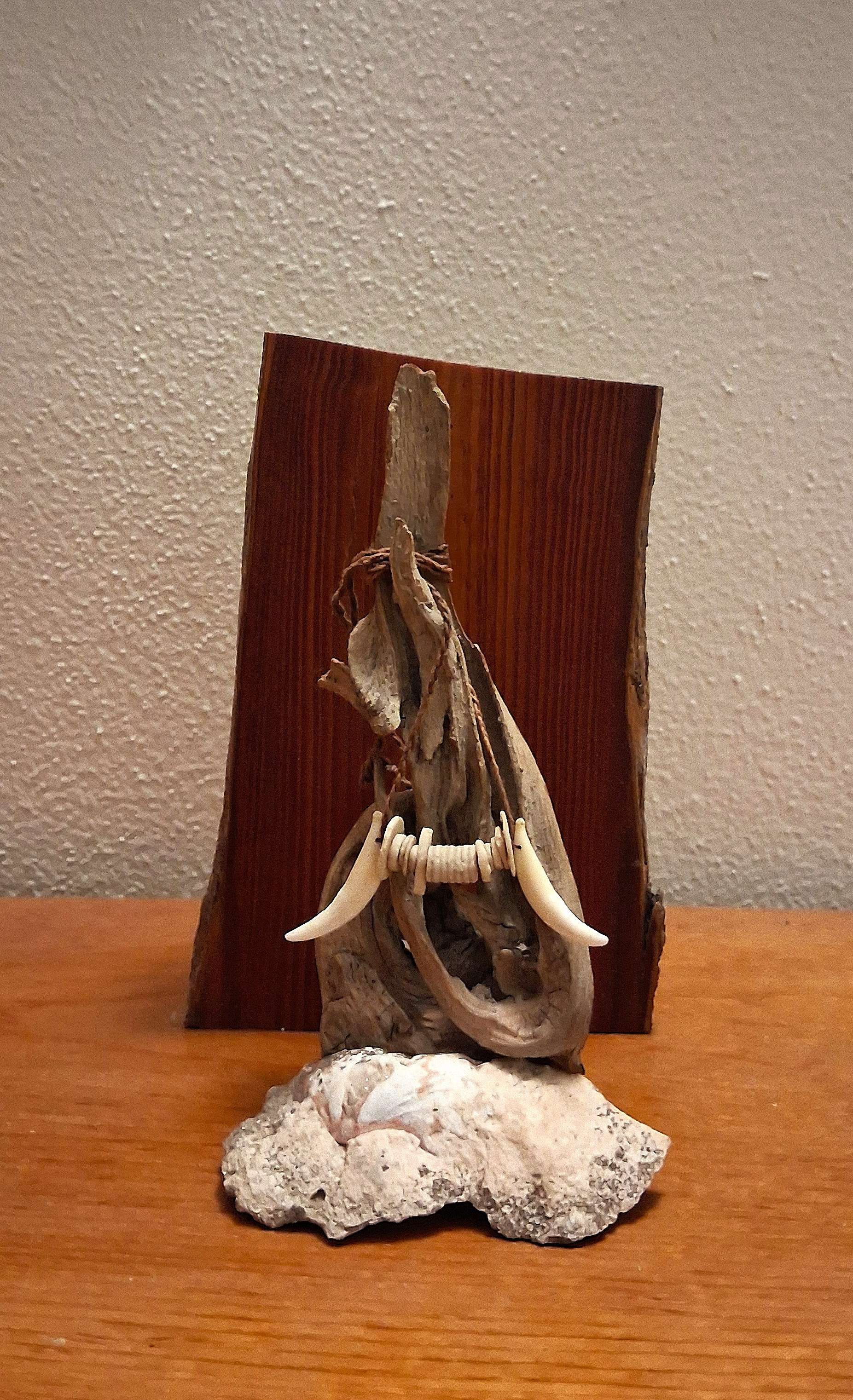Limestone, quartz, fossilized shell, juniper, crinoids, canines, cotton thread, and resinous wood. [Photo
